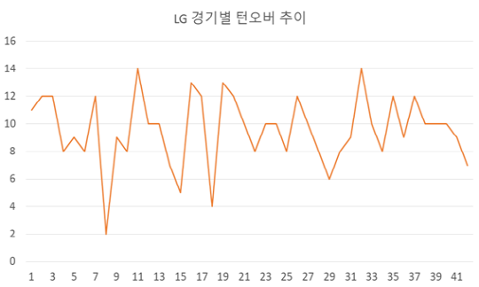 LG는 42경기에서 총 401개, 평균 9.6개의 턴오버를 기록했다. 합계 턴오버는 KGC인삼공사(총 387회)가 가장 적으나, 팀별로 경기 수가 상이한 관계로 평균 턴오버를 따져보면, 리그에서 LG의 평균 턴오버가 가장 적다. 경기별 턴오버 추이를 나타낸 그래프의 수치를 보면, 턴오버 1위 현대모비스와는 개수 면에서 상이하다. LG는 올 시즌 한 경기 최소 턴오버(2회) 기록을 세우기도 했다.