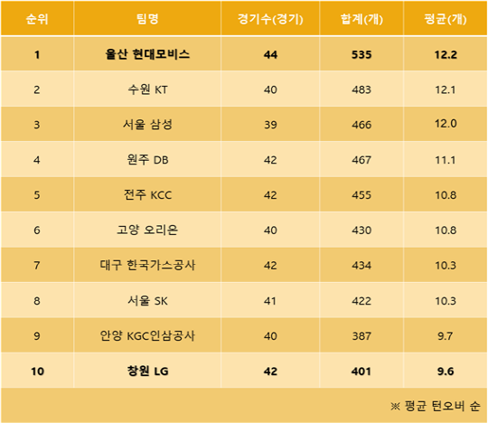 그렇다면 턴오버가 실점으로 연결된 비율은 어느 정도일까. 현대모비스가 44경기에서 기록한 535회의 턴오버 중 실점으로 연결된 턴오버는 총 200회. 전체 턴오버의 37.4%에 달한다.