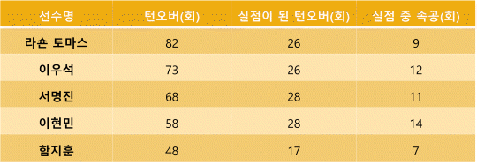 실점이 된 턴오버 중 상대의 속공 찬스가 된 건 76회로 실점으로 연결된 턴오버의 38%에 달했다. 얼 클락을 제외하고 현대모비스 턴오버 부문 상위 5인을 보면, 라숀 토마스의 턴오버(82회)가 가장 많았다. 뒤는 이우석(73회), 서명진(68회), 이현민(58회), 함지훈(48회) 등이 이었다. 앞선에서 빼앗긴 볼이 실점으로 이어질 가능성이 큰 건 자명한 사실이다. 대체적으로 가드 포지션의 선수들은 총 턴오버 수에 비해 실점이 된 턴오버와 속공으로 실점이 된 턴오버의 수가 많았다.
