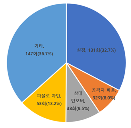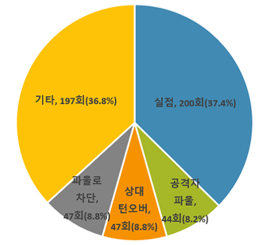 공격자 파울이 된 턴오버 즉, 상대의 굿디펜스로 인해 공격권을 잃은 건 44회에 해당했다. 이를 제외한 턴오버에서 실점으로 연결된 비율은 40.7%까지 상승했다. 현대모비스의 턴오버가 이내 상대 팀의 턴오버가 된 경우와 턴오버를 파울로 차단한 경우는 각 47회로 전체 턴오버의 8.8%씩을 차지했다. 기타 상황은 전체 턴오버의 36.8%였는데, 기타 상황은 턴오버가 실점이 아닌 상대 팀의 공격 실패, 교체나 작전 타임으로 연결된 것 등을 포함한다.
