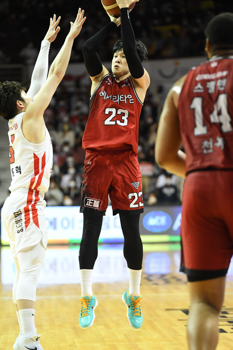 KGC인삼공사의 3점이 위력적인 이유. 전성현이라는 확실한 슈터가 있기 때문이다. 어느 타이밍에서든 어느 거리에서든 던지는 전성현이 있기에, KGC인삼공사의 3점포가 더 위력적이다.