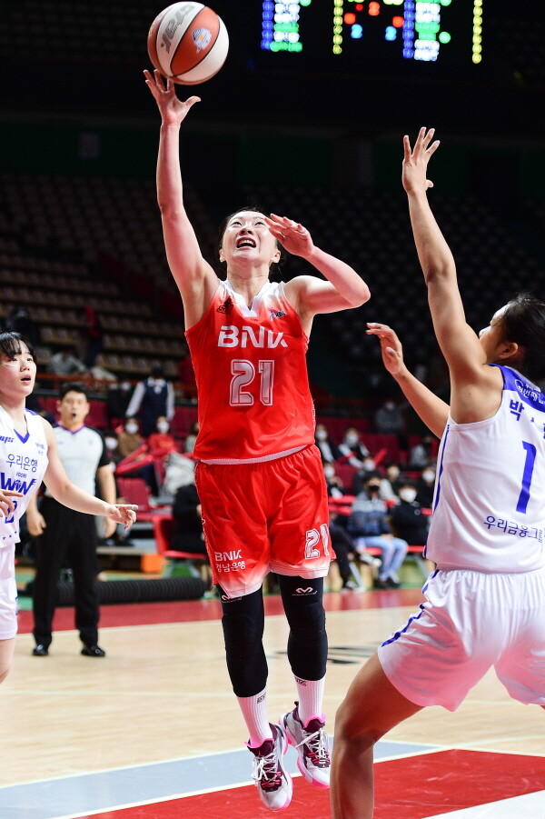 BNK는 김진영(176cm, F)이 15점 3리바운드를 기록했다. 팀 내 최다 득점을 성공했다. 진안(185cm, F)은 12점 9리바운드로 뒤를 받쳤다. 반면, 우리은행은 박혜진(178cm, G)이 24점으로 분전했지만, 패배를 막지 못했다.