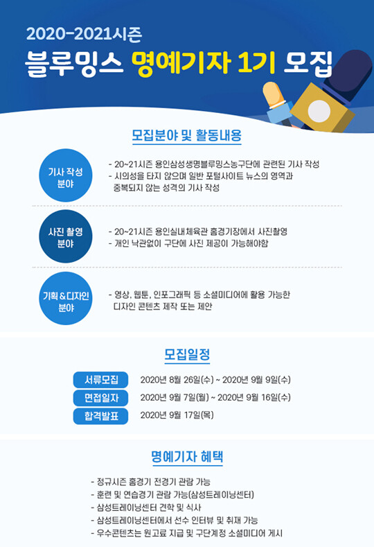이번 블루밍스 명예기자는 2020년이 첫 기수이다. 10월 초에 있을 발대식을 시작으로, 2021년 5월까지 약 7개월 동안 삼성생명을 취재하게 된다. 지원 분야는 기사 작성과 사진 촬영, 기획 및 디자인 등 3가지 분야로 블루밍스에 관심이 많은 팬이라면 누구나 지원할 수 있다.