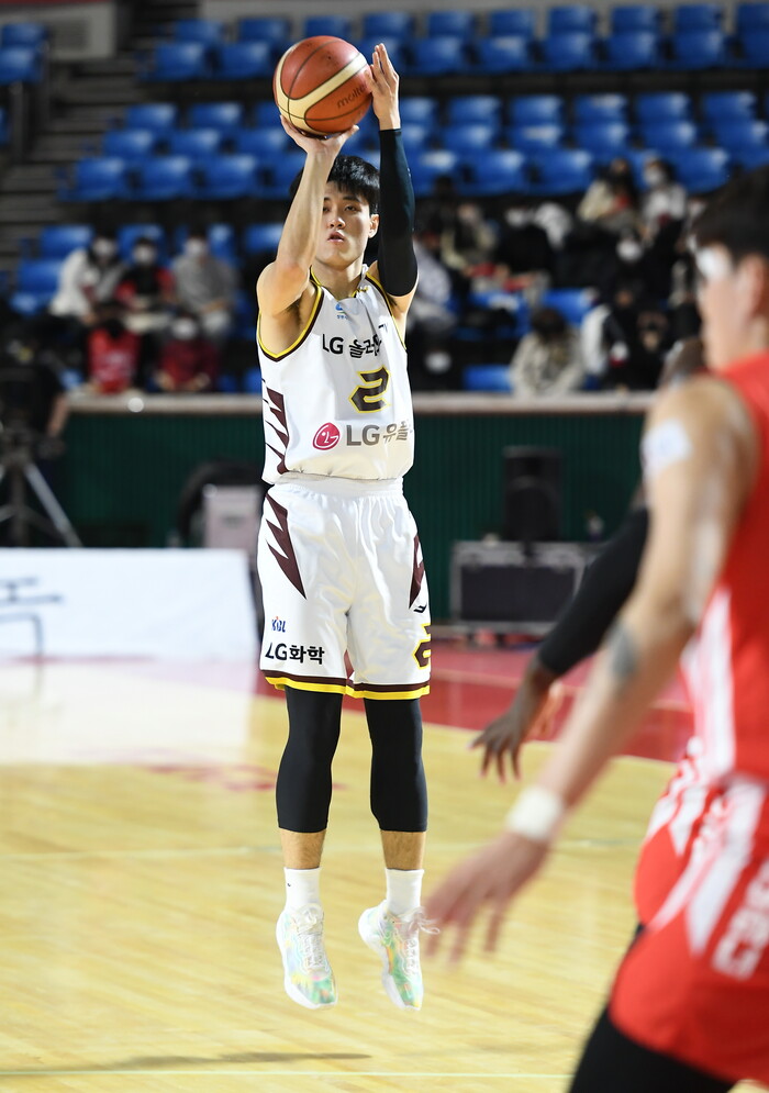 투지를 보여준 LG 선수 중 한 명은 이승우(193cm, F)였다. 이승우는 2021 KBL 국내신인선수 드래프트에서 전체 5순위로 LG에 입단한 신인. 한양대 3학년을 마친 얼리 엔트리이자, 볼 핸들링과 스피드를 겸비한 자원으로 주목받았다.