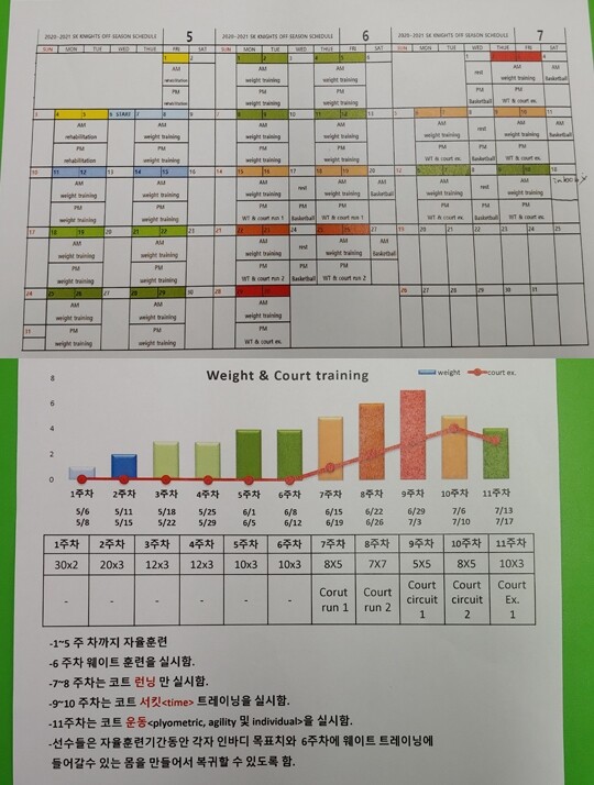 SK는 2주 동안 1주일에 4번 코트 런닝 훈련(수요일 제외)을 한다. 2주 동안 심폐지구력을 끌어올린 후, 코트에서 서킷 트레이닝을 2주 동안 한다. 한대식 체력 코치는 “그 2주가 선수들에게는 가장 힘들 거다. 운동 강도가 가장 높은 기간이기 때문이다”며 9~10주차 훈련을 가장 힘들다고 설명했다.