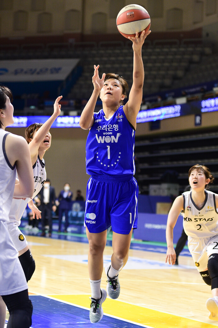 수비 집중력도 썩 좋지 않았다. 높이 싸움에도 큰 힘을 싣지 못했다. KB스타즈 진영에서 스틸 후 득점하는 재치를 보여줬지만, 큰 기여도를 남기지 못했다. 1쿼터 종료 3분 7초 전 벤치로 들어가야 했다. 우리은행도 16-22로 열세에 놓였다.