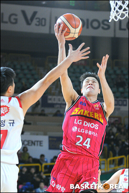 [바스켓 코리아 = 창원 / 박영태 기자] 20일 경남 창원실내체육관에서 열린 2017-2018 정관장 프로농구 창원 LG와 고양 오리온의 경기에서 LG 조성민이 오리온 전정규를 피해 레이업을 성공시키고 있다.