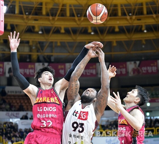 부산 KT 맥키네스와 창원 LG 김종규가 리바운드 경합을 벌이고 있다.