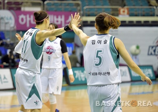 KEB 하나은행 강이슬이 파울을 얻어낸후 김이슬과 하이파이브를 하고 있다.