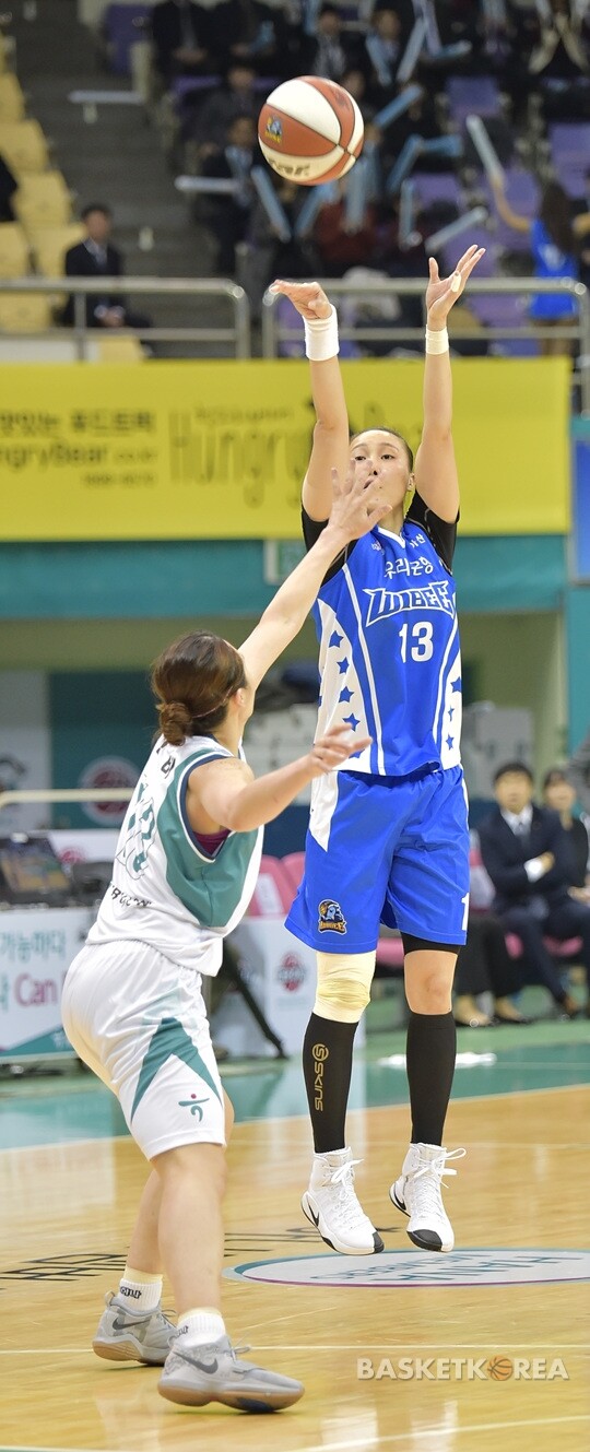 우리은행 김정은이 3점슛을 시도하고 있다.