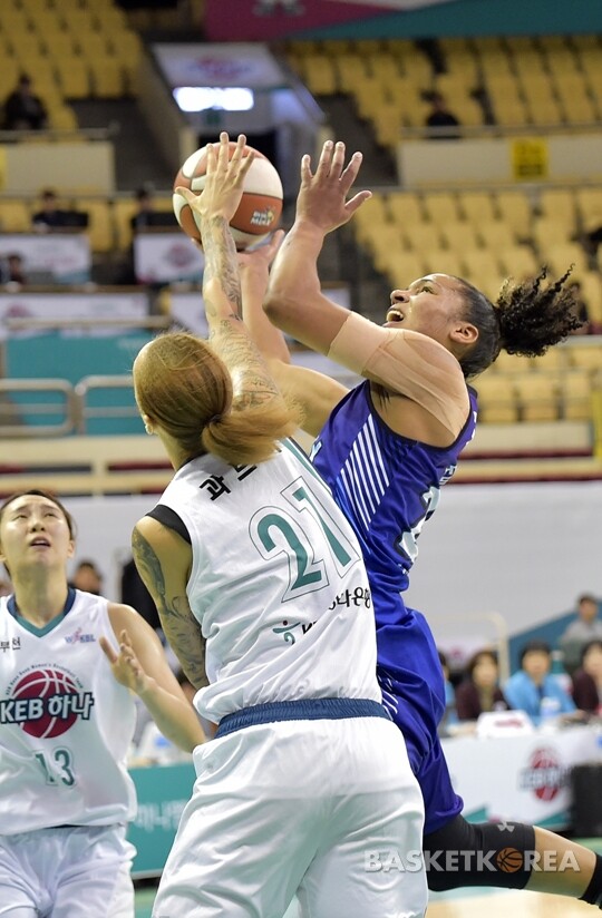 삼성생명 토마스가 수비수를 앞에두고 슛을 시도하고 있다.