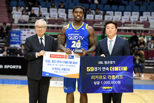 | KBL 최다인 59경기 연속 더블더블 기록을 세운 삼성 리카르도 라틀리프 |