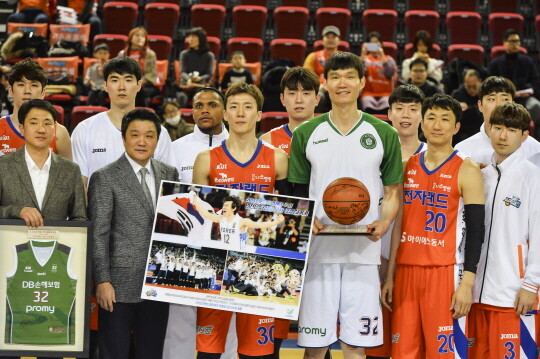 이어서 김주성은 자신이 직접 사인을 한 유니폼을 현판에 넣어 전자랜드에 선물한 후 기념촬영에 나섰다. 아울러 전자랜드는 김주성이 아시안게임 금메달이 확정된 후 두 팔 벌려 코트를 누비는 사진을 안겼다. 김주성은 대한민국 농구 선수들 중 유일하게 아시안게임에서 두 번의 우승을 차지한 선수다.