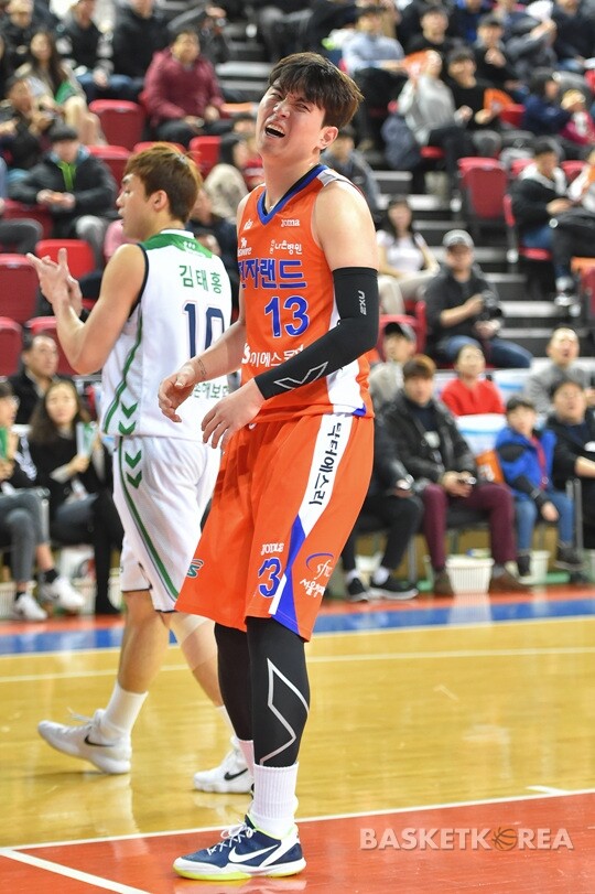 전자랜드 강상재가 파울을 선언하지 않자 아쉬워하고 있다.