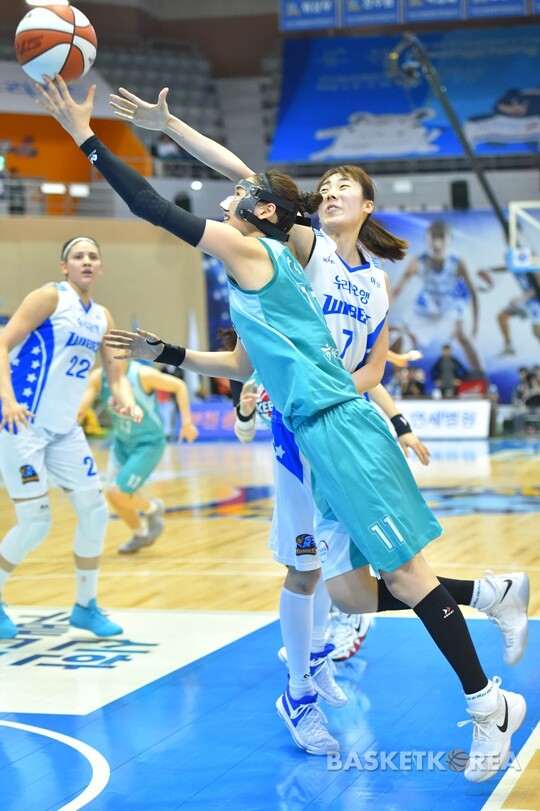 KEB 강이슬이 우리은행 박혜진을 앞에 두고 레이업슛을 던지고 있다.