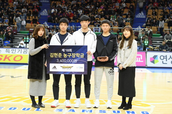 이날 하프타임에는 제18회 김현준 농구장학금 전달식도 열렸다. 고 김현준 전 삼성 코치는 삼성 선수 중 유일하게 영구결번(10번) 된 선수다.