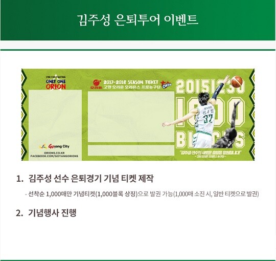 고양 오리온은 17일(토) 고양체육관에서 열리는 2017-2018 정관장 프로농구 원주 DB와의 홈경기에 김주성을 위한 특별 이벤트를 준비했다. 바로 김주성의 모습이 프린팅 된 기념 티켓을 제작해 팬들에게 발권하는 것.