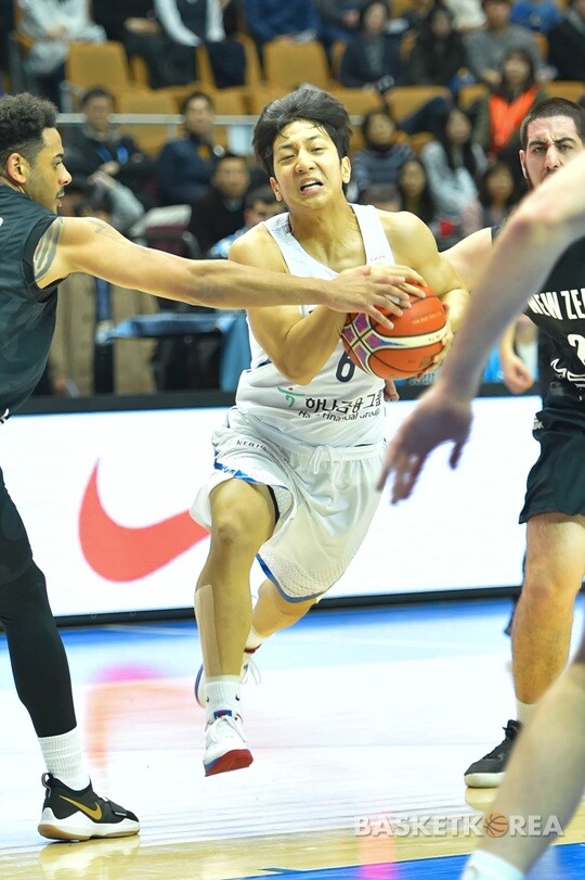대한민국 허훈이 뉴질랜드 수비수들 사이로 돌파를 시도하고 있다.