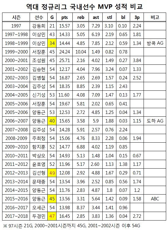 물론 1998~1999시즌 MVP 이상민은 11경기, 2006~2007시즌 MVP 양동근은 14경기, 2015~2016시즌 MVP 양동근은 9경기에서 코트를 밟지 못했다. 이들은 국가대표에 차출되어 뛰고 싶어도 뛸 수 없는 상황이었다. 두경민과 엄연히 다르다.
