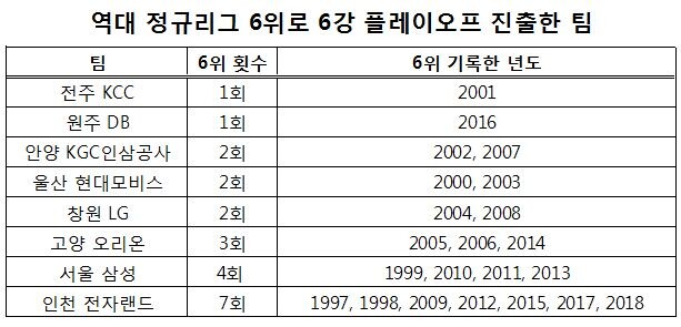 전자랜드는 2006~2007시즌 이후 6강 플레이오프에서 6위가 3위를 꺾은 유일한 경험을 가지고 있다. 그건 자신감으로 이어진다. 반대로 KBL 6강 플레이오프 역사에서 6위가 3위와 6강 플레이오프에서 그만큼 밀렸다는 의미이기도 하다.