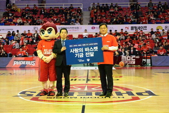 [바스켓코리아 = 김우석 기자] 울산 현대모비스피버스 프로농구단(단장 : 장동철)이 오늘 울산 동천체육관에서 열린 6강 플레이오프 2차전에서 사랑의 바스켓 모금액 전달식을 가졌다.