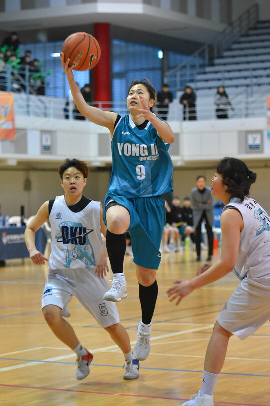 후반 첫 공격을 아쉽게 마무리한 양 팀은 팽팽한 경기를 진행했다. 단국대가 스틸을 통해 선제 득점을 올렸고, 용인대는 김수진의 레이업 득점으로 균형을 맞췄다. 이후에도 서로 주고받는 득점이 이어지며 접전을 이어갔다.