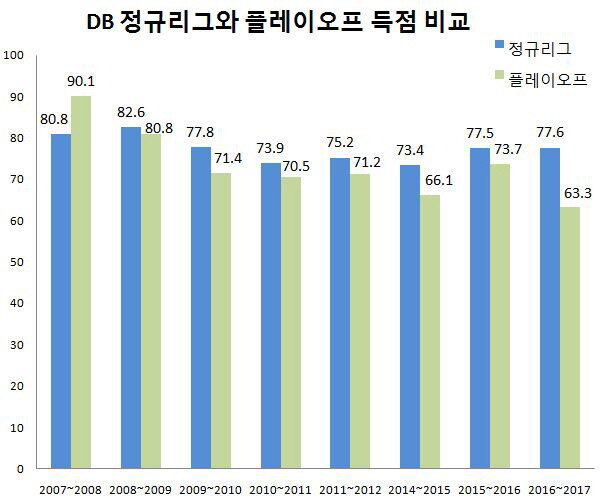 보통 정규리그보다 플레이오프의 득점이 떨어진다. 최근 10시즌 동안 DB의 득점을 비교해봐도 그렇다. 다만, 통합우승했던 2007~2008시즌에는 정규리그 평균 80.8점보다 플레이오프 평균 90.1점으로 약 10점 가량 더 많은 득점을 올렸다. DB가 마지막으로 100점대를 기록했던 그 시즌이다.