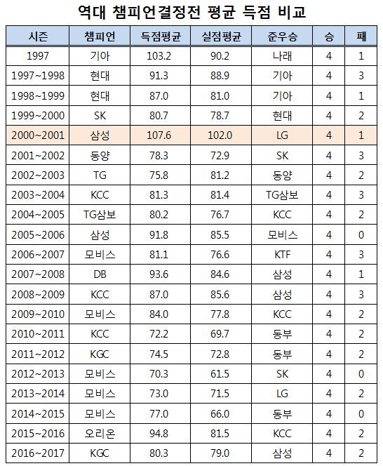 최근 10년 동안 챔피언결정전에서 90점 이상 득점한 팀은 2007~2008시즌 93.6점의 동부와 2015~2016시즌 94.8점의 오리온이다.