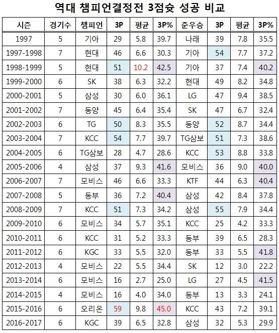 챔피언결정전에서 가장 많은 3점슛을 성공한 팀은 2015~2016시즌 3점슛 59개를 퍼부은 오리온이다. 오리온은 당시 131개 중 59개를 성공해 성공률 45.0%를 기록, 챔피언결정전 최고 3점슛성공률까지 동시에 작성했다.