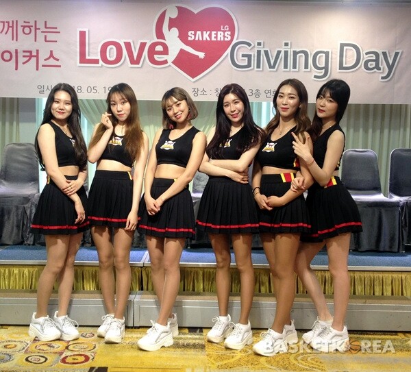 지난 19일 창원에서 열린 팬 사은행사 ‘러브 기빙 데이(Love Giving Day)’에 참가한 LG 치어리더. 사진 중 샤비스로 데뷔하는 치어리더는 왼쪽에서 2번째 허은비, 4번째 박아람, 제일 오른쪽 이은송이다.