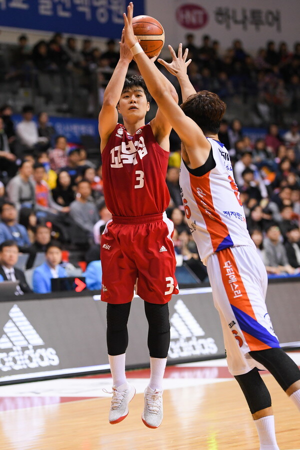 한호빈은 2017~2018시즌 21경기에서 73개의 3점슛을 시도해 27개를 넣어 성공률 37.0%를 기록했다. 시도 자체가 경기당 3.5개로 대폭 늘었다. 그만큼 슛 기회에서 주저하지 않고 자신감 있게 던졌다.