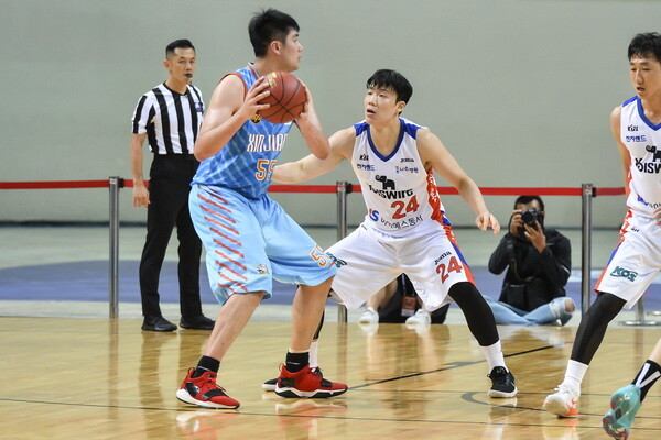 | 중국 프로팀 신장 플라잉 타이거스와 경기에서 수비를 하고 있는 전자랜드 박봉진 |