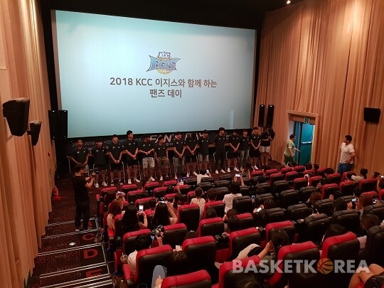 그렇게 시간이 흘러 행사 시작 시간인 3시 30분이 되자 전주KCC 선수단이 모습을 드러냈다. 국가대표 일정 이후 컨디션 조절이 필요한 이정현을 제외한 선수단 전원이 이날 행사에 참여했다. 선수단이 등장하자 우레와 같은 박수와 환호성이 영화관을 가득 채웠다. 선수들은 자신들을 환영해주는 팬들을 향해 환한 미소와 감사 인사를 건넸다.