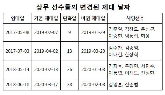현재 상무에는 18명의 프로 선수들이 군 복무 중이다. 지난해 10명, 올해 8명이 군복을 입었다. 예년과 달리 2년 연속 두 차례에 걸쳐 입대했다는 공통점을 가지고 있다. 때문에 이들의 제대 날짜는 4가지로 나뉜다.