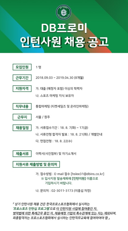 원주 DB(단장 신해용)는 7일 보도자료를 통해 2018-2019시즌 동안 함께 할 인턴사원을 채용한다고 밝혔다.