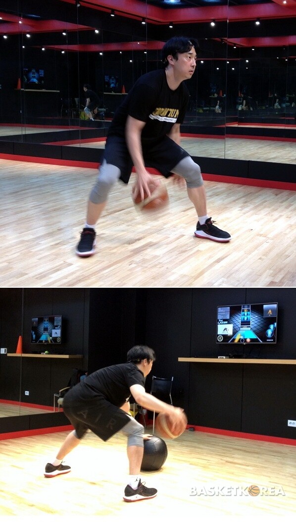 KT 윤여권 매니저가 처음으로 이 기기로 드리블 연습을 해봤다. 윤여권 매니저는 “혼자 드리블 연습을 하면 볼을 볼 때가 있는데 이렇게 연습하니까 볼을 보지 못하는 게 가장 좋은 거 같다”고 사용해본 소감을 전했다.