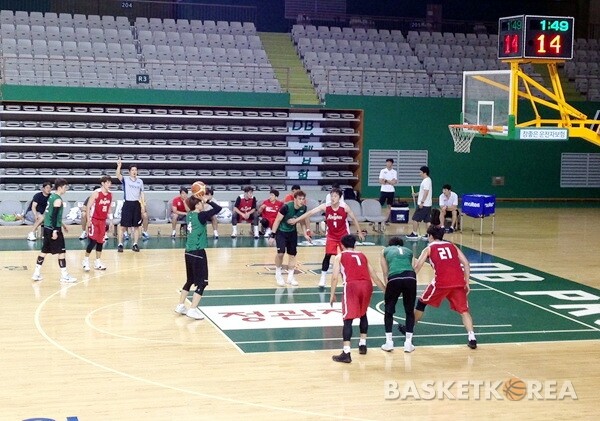 | 14일 원주종합체육관에서 열린 원주 DB와 서울 SK의 연습경기 한 장면 |