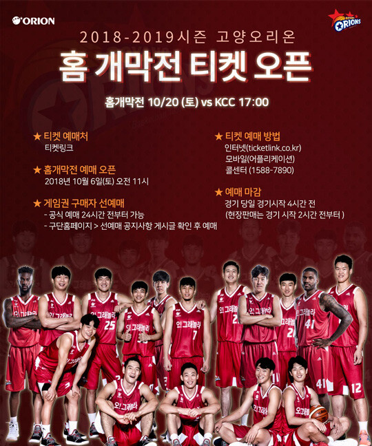 고양 오리온은 오는 20일 오후 5시 고양체육관에서 열리는 전주 KCC와의 2018-2019 프로농구 홈 개막전 티켓을 6일부터 판매한다.