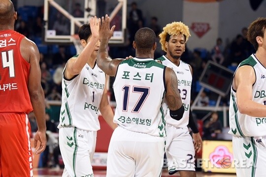 [바스켓코리아=잠실학생/신혜지 기자] 13일 잠실 학생육관에서 벌어진 2017-18 5GX프로농구 개막전에서 DB 한정원과 포스터가 하이파이브하고 있다.