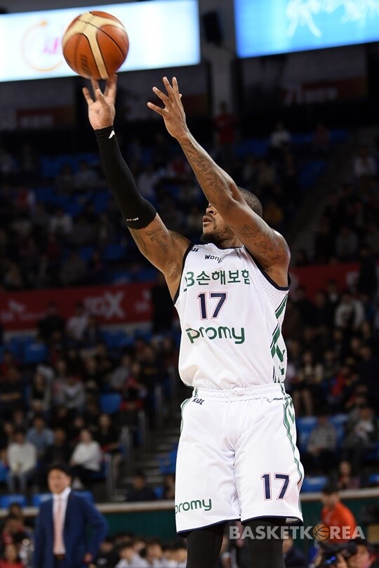 [바스켓코리아=잠실학생/신혜지 기자] 13일 잠실 학생육관에서 벌어진 2017-18 5GX프로농구 개막전에서 DB 포스터가 외곽슛을 시도하고 있다.
