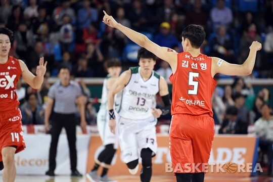 | 공격 성공후 백코트하며 선수들에게 작전을 전달하는 SK 김선형 |