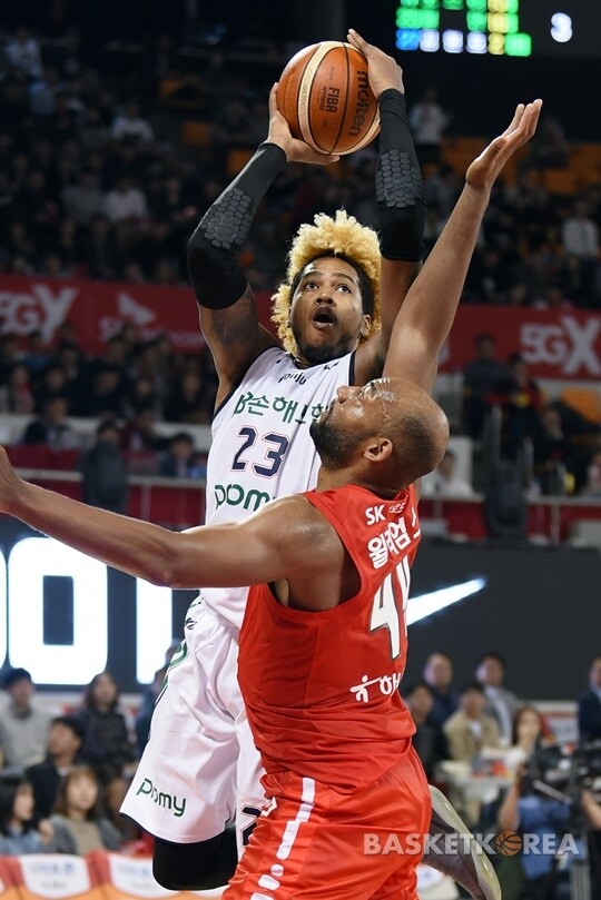 [바스켓코리아=잠실학생/신혜지 기자] 13일 잠실 학생육관에서 벌어진 2017-18 5GX프로농구 개막전에서 DB 틸먼이 SK 윌리엄스의 수비에 아랑곳않고 슛을 시도하고 있다.