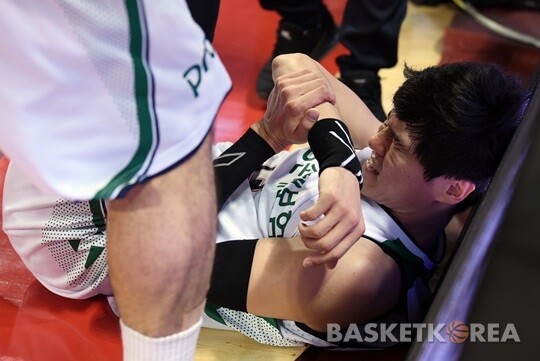 | 허슬 플레이로 광고판에 충돌한 후 통증을 호소하는 DB 윤호영 |