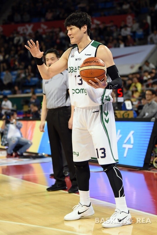 [바스켓코리아=잠실학생/신혜지 기자] 13일 잠실 학생육관에서 벌어진 2017-18 5GX프로농구 개막전에서 DB 윤호영이 선수들에게 템포를 늦출 것을 전달하고 있다.