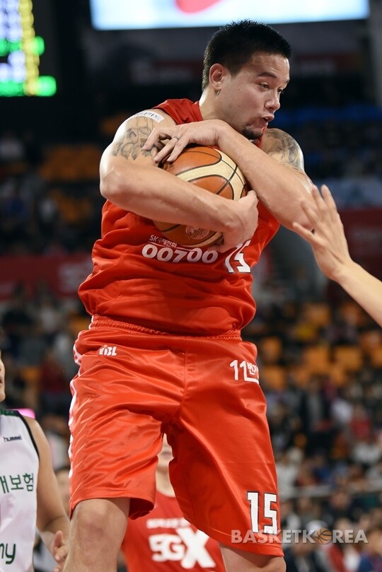 [바스켓코리아=잠실학생/신혜지 기자] 13일 잠실 학생육관에서 벌어진 2017-18 5GX프로농구 개막전에서 SK 김민수가 리바운드를 잡아내고 있다.