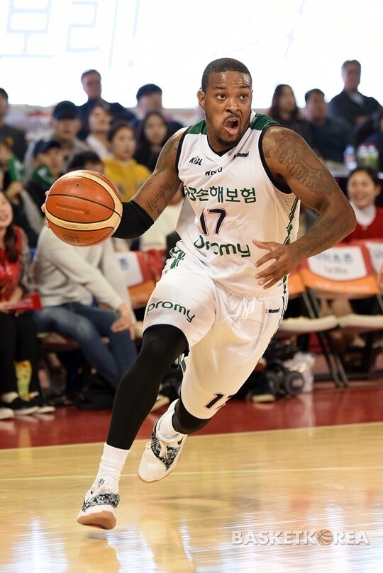 [바스켓코리아=잠실학생/신혜지 기자] 13일 잠실 학생육관에서 벌어진 2017-18 5GX프로농구 개막전에서 DB 포스터가 골밑으로 빠르게 진입하고 있다.