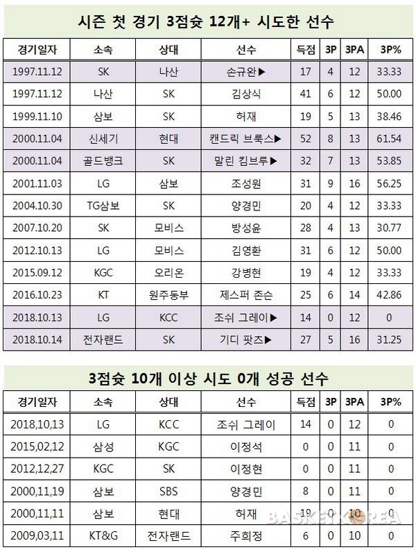 LG 단신 외국선수 그레이는 13일 전주 KCC와 맞대결에서 12개의 3점슛을 모두 놓쳤다. KBL 역대 3점슛 0% 선수 중 최다 실패 선수다. 이는 3점슛을 하나도 못 넣은 선수 중 최다 실패 기록이다. 기존 기록은 이정석, 이정현, 양경민의 11개였다.