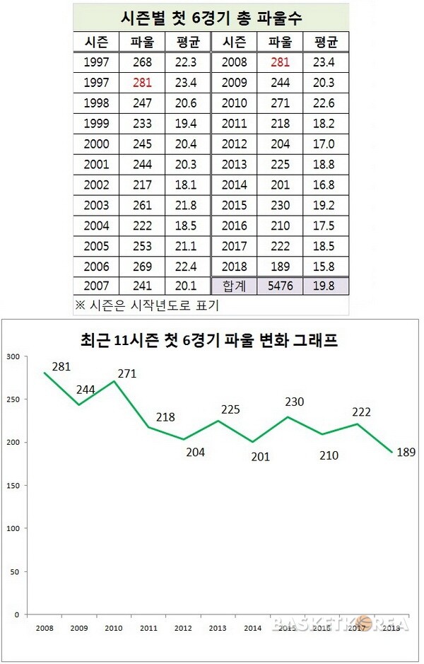 기존 최소 기록은 2014~2015시즌 201개(평균 16.8개)였다. 초반 6경기에서 파울이 가장 많았던 때는 1997~1998시즌과 2008~2009시즌의 281개(평균 23.4개)로 이번 시즌보다 92개나 더 많았다.