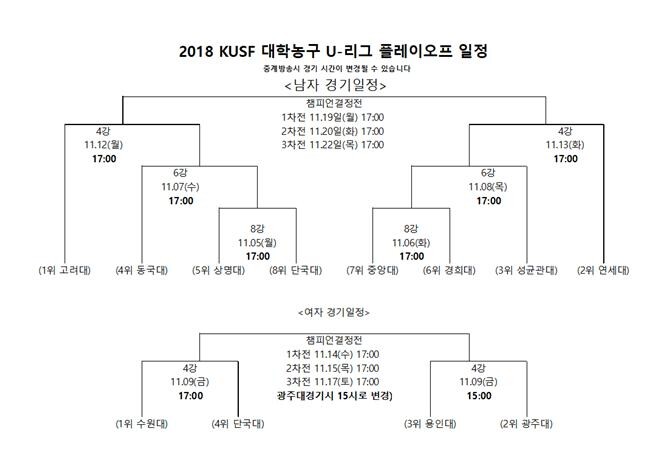 여자부 4강 플레이오프는 11월 9일(금) 용인대-광주대 경기는 오후 3시, 수원대-단국대 경기는 오후 5시이다.