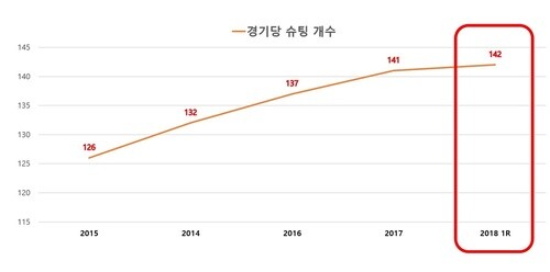 1라운드에서 한 경기 동안 일어난 슈팅 개수는 142회로 지난 5년 동안 가장 많았다. 팬들은 5년 전과 비교해 한 경기에서 16회나 더 많은 슈팅을 볼 수 있게 된 것이다.